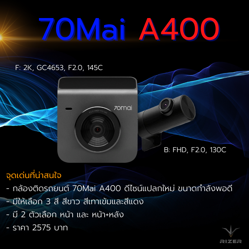 ตัวถัดมาก็ยังคงเป็นกล้องติดรถยนต์จากแบรนด์ 70Mai อย่างเจ้าตัวกล้องติดรถยนต์ 70Mai A400 อยู่นั่นเองค่ะ สำหรับกล้องติดรถยนต์ 70Mai A400 ตัวกล้องหน้าจะมีความคมชัด 2K ใช้เซนเซอร์ GC4653 รูรับแสงกว้าง F2.0 และมีมุมมองกล้องกว้าง 145องศา ส่วนกล้องหลังมีความคมชัด Full HD รูรับแสงกว้าง F2.0 และมีมุมมองกล้องกว้าง 130องศา ค่ะ