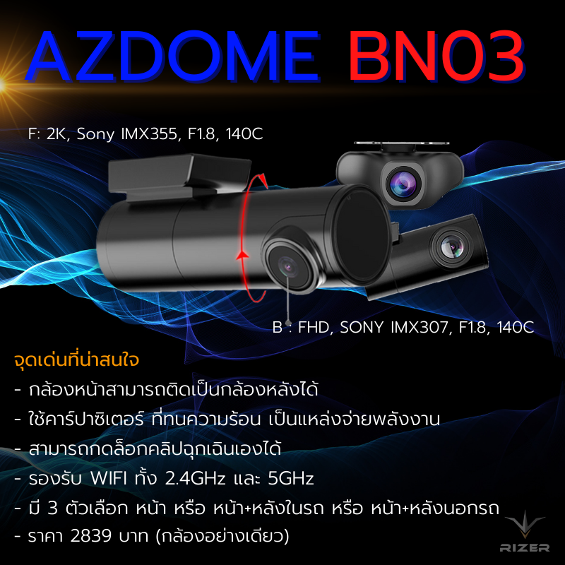 สำหรับตัวสุดท้ายก็คือกล้องติดรถยนต์ AZDOME BN03 จากแบรนด์ AZDOME ตัวนี้เป็นกล้องติดรถยนต์ที่ไม่มีหน้าจอ ซึ่งล่าสุดทางแบรนด์ได้เปลี่ยนเซนเซอร์จาก OS04B1 มาเป็น Sony IMX335 ที่ทำให้ภาพที่บันทึกได้สวยคมชัดมากขึ้น และนอกจากนี้ตัวกล้องหน้ายังมีความคมชัด 2K รูรับแสงกว้าง F1.8 และมีมุมมองกล้องกว้าง 140องศา ส่วนกล้องหลังมีความคมชัด Full HD ใช้เซนเซอร์ SONY IMX307 รูรับแสงกว้าง F2.0 และมีมุมมองกล้องกว้าง 140องศาค่ะ