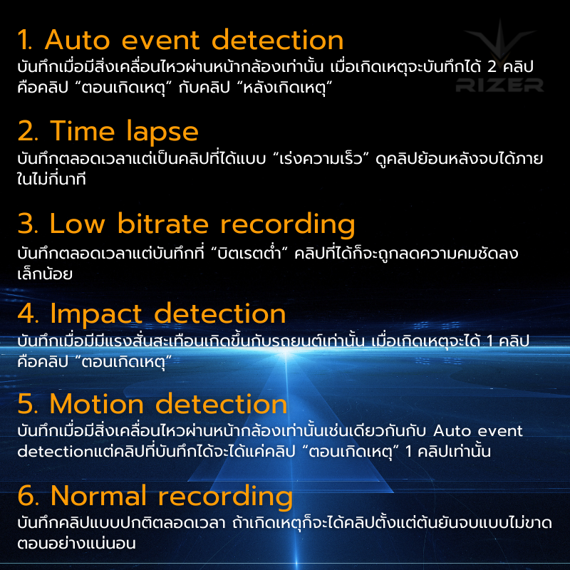โหมดบันทึกตอนจอดแบบ Auto event detection เป็นการบันทึกวิดีโอเมื่อมีสิ่งเคลื่อนไหวผ่านหน้ากล้องติดรถยนต์เท่านั้น และคลิปวิดีโอ 2 คลิป เช่น เกิดเหตุรถชน กล้องติดรถยนต์ก็จะบันทึกคลิปตอนชนให้ 1คลิป และบันทึกคลิปก่อนชนให้อีก 1คลิป ซึ่งการบันทึกคลิปเฉพาะตอนที่มีสิ่งเคลื่อนไหวผ่านหน้ากล้องเท่านั้นก็จะช่วยในเรื่องของการประหยัดพื้นที่เมมโมรี่การ์ดนั่นเองค่ะ