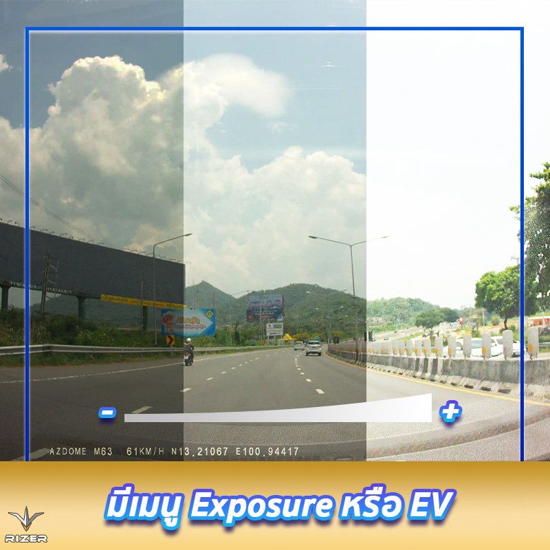 เมนู Exposure หรือ EV ในกล้องติดรถยนต์ AZDOME M63 คือเมนูชดเชยแสงสามารถปรับแสงให้กล้องติดรถยนต์ สว่างขึ้นหรือมืดลงได้ แนะนำให้เลือกปรับใช้ตามสถานการณ์และไม่ควรปรับให้สว่างมากจนเกินไปเพราะจะทำให้คลิปที่ได้นั้นมีแสงสีขาวมากซึ่งเป็นส่วนที่ทำให้ภาพเบลอดูไม่ชัดนั่นเองค่ะ