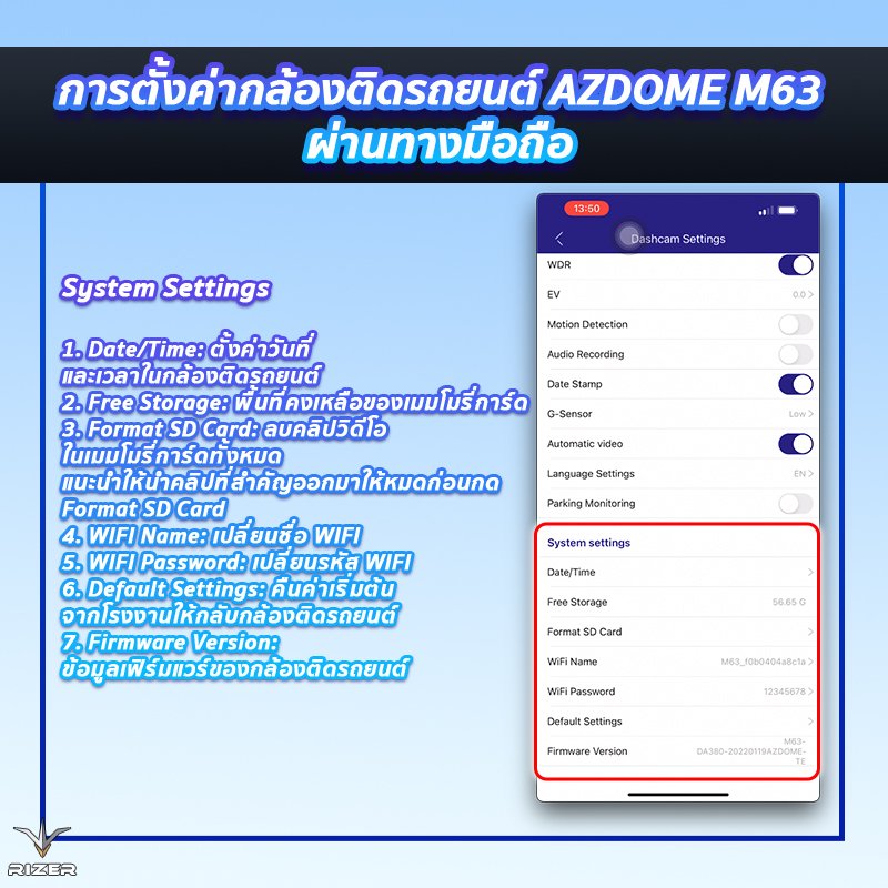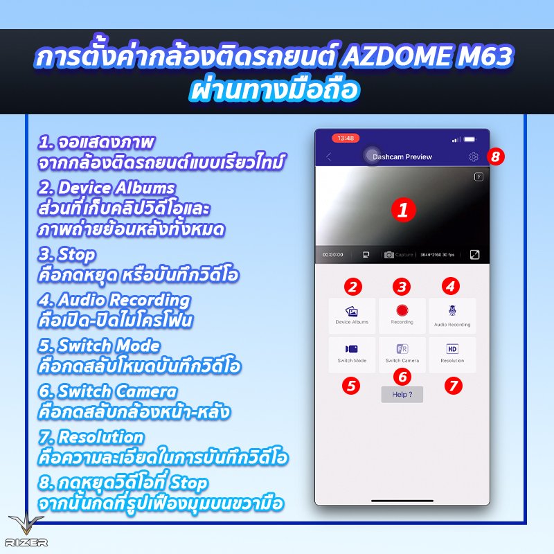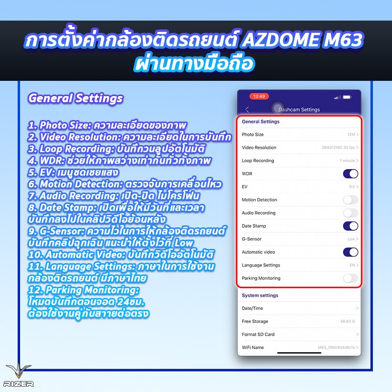 การตั้งค่ากล้องติดรถยนต์ AZDOME M63 ผ่านทางมือถือ