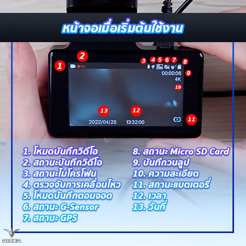 - กด 1 ครั้งเพื่อเปิดกล้องติดรถยนต์ และกดค้าง 2 วินาทีเพื่อปิดกล้องติดรถยนต์