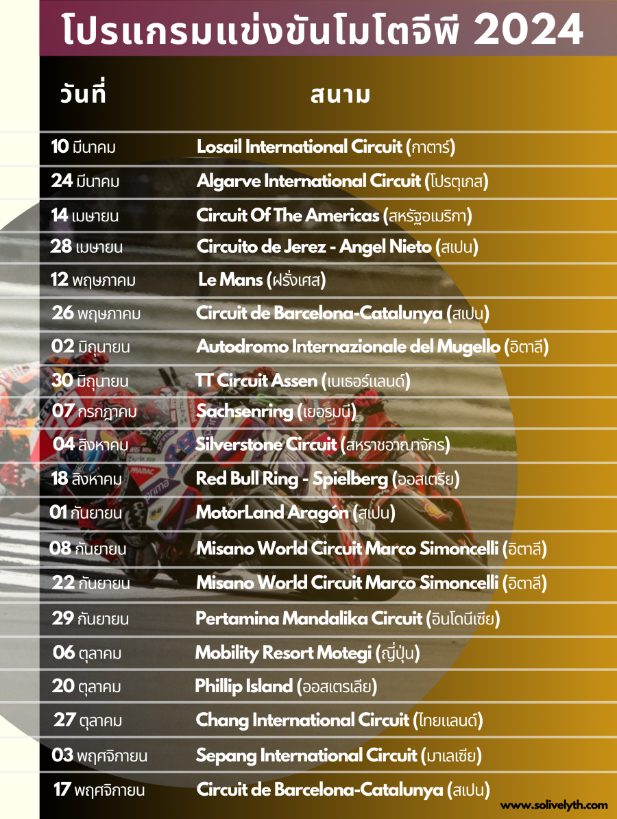 ดอร์นา สปอร์ต ประกาศโปรแกรมการแข่งขันรถจักรยานยนต์ทางเรียบชิงแชมป์โลก MotoGP ฤดูกาล 2024 ออกมาแล้ว สนามที่อารากอนกลับเข้ามาในปฏิทินอีกครั้งในฤดูกาลนี้ มีหลายสนามที่ปรับเปลี่ยนลำดับการแข่งขันจะมีที่ไหนบ้าง เช็คเลย!