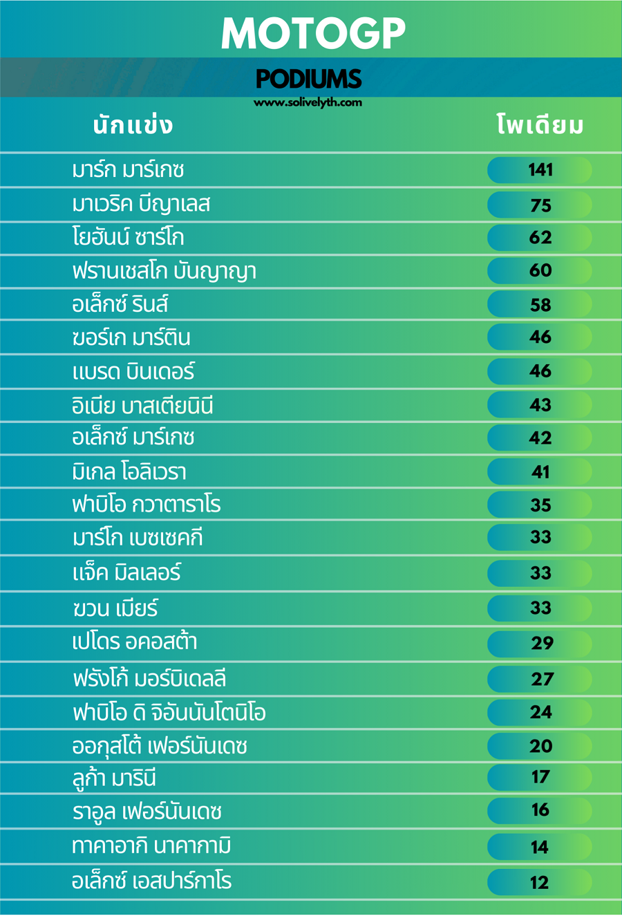 อันดับ 2 ไม่ใช่ใครที่ไหน มาเวริค บีญาเลส เจ้าของสถิตินักบิดคนแรกที่ชนะการแข่งขันกับผู้ผลิตรถมอเตอร์ไซค์ 3 แบรนด์ในยุค MotoGP โดยทั้ง 75 โพเดียมของท็อปกันมาจากคลาส 125cc 9 โพเดียม , Moto3 22 โพเดียม , Moto2 9 โพเดียม และ MotoGP 35 โพเดียม