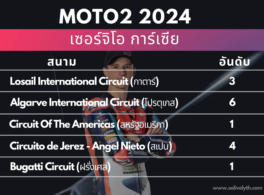 เซอร์จิโอ การ์เซีย เปิดฤดูกาล 2024 ด้วยโพเดียมอันดับ 3 ที่กาตาร์ จากนั้นจบอันดับ 6 ที่โปรตุเกส ก่อนจะได้เฉลิมฉลองชัยชนะครั้งแรกในคลาส Moto2 ที่สหรัฐอเมริกา การ์เซียหลุดโพเดียมอีกครั้งที่เฆเรซก่อนจะกลับมาคว้าชัยชนะครั้งที่สองที่ฝรั่งเศส รวมคะแนนสะสมตอนนี้ เซอร์จิโอ การ์เซีย มี 89 แต้ม เป็นผู้นำในตารางคะแนนแชมเปียนชิพปัจจุบัน แน่นอนว่าเส้นทางการแข่งขัน Moto2 ฤดูกาลนี้ยังมีอีกยาวไกลแต่การจะก้าวขึ้นมาเป็นแชมเปียนชิพลีดเดอร์ในการแข่งขันระดับกรังด์ปรีซ์ไม่ใช่เรื่องง่ายแน่นอน แล้วมาดูกันว่านักบิดดาวรุ่งวัย 21 ปีคนนี้จะสามารถรักษาตำแหน่งผู้นำไปจนจบฤดูกาลได้หรือไม่ หรือเขาจะปิดฤดูกาล 2024 ที่อันดับไหน? ติดตามทุกความเคลื่อนไหวได้ที่นี่