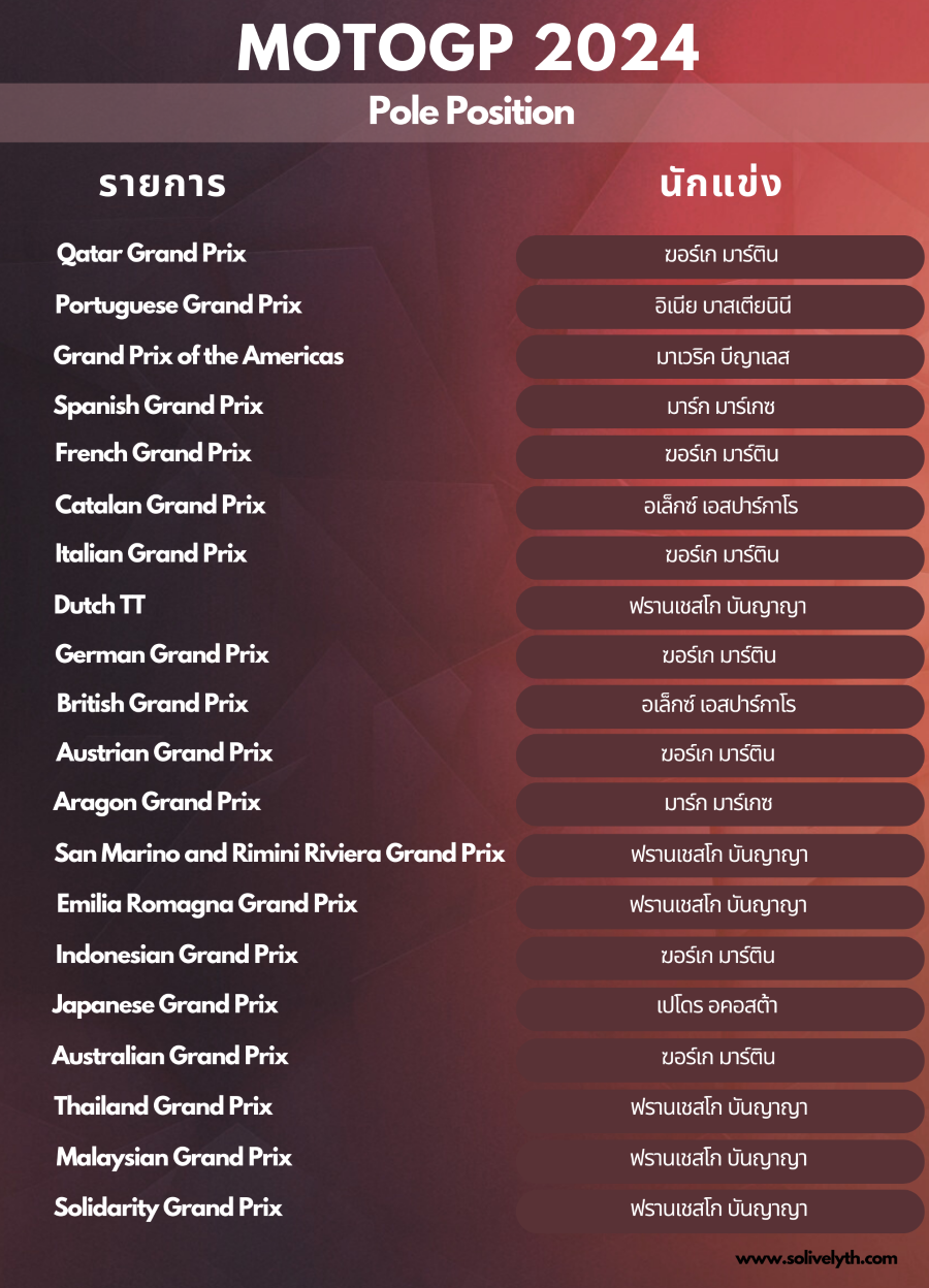 จบไปสักพักแล้วสำหรับการแข่งขันรถจักรยานยนต์ทางเรียบชิงแชมป์โลก MotoGP 2024 แชมป์โลกประจำฤดูกาลนี้คือ ฆอร์เก มาร์ติน นักบิดสแปนิชวัย 26 ปี จากทีม Prima Pramac Racing นอกจากตำแหน่งแชมป์โลกที่แฟนๆให้ความสนใจแล้วยังมีสถิติอีกมากมายที่น่าสนใจไม่แพ้กัน วันก่อน Solivelyth ชวนเพื่อนๆไปเช็คสถิติ Top Speed กันแล้ว วันนี้มาดูกันว่านักบิดที่คว้าโพลโพซิชั่นแต่ละสนามใน MotoGP 2024 จะมีใครบ้าง ไปดูกันเลย