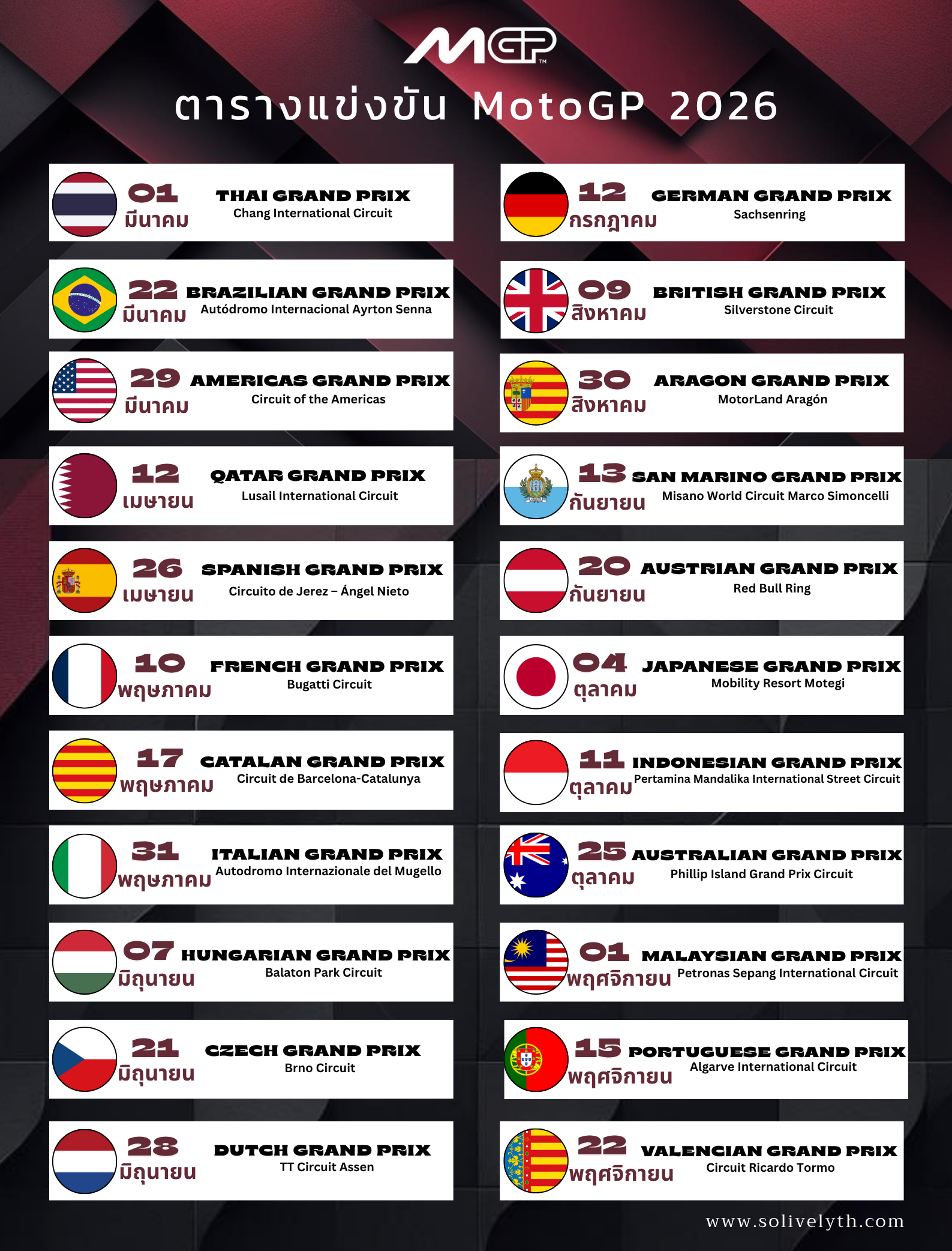 MotoGP เผยปฏิทินการแข่งขัน MotoGP 2026 ทั้ง 22 สนาม ครอบคลุม 5 ทวีปทั่วโลก โดยจะเริ่มการแข่งขันตั้งแต่ปลายเดือนกุมภาพันธ์ยาวไปจนถึงปลายเดือนพฤศจิกายน ไฮไลต์ที่น่าสนใจในฤดูกาลนี้คือการกลับเข้ามาในปฏิทินการแข่งขันอีกครั้งของรายการ Brazilian Grand Prix โดยนักบิดทุกคนจะได้ไปเยือน Autódromo Internacional Ayrton Senna ในวันที่ 20 - 22 มีนาคม ต่อจากสนามเปิดฤดูกาลที่ประเทศไทย ส่วนรายการอื่นๆมีการปรับปฏิทินบ้างในบางสนามเพื่อความเหมาะสมกับสภาพอากาศ จะมีสนามไหนบ้างเช็ค ตารางการแข่งขันโมโตจีพี 2026 จากข้อมูลด้านล่างเลย