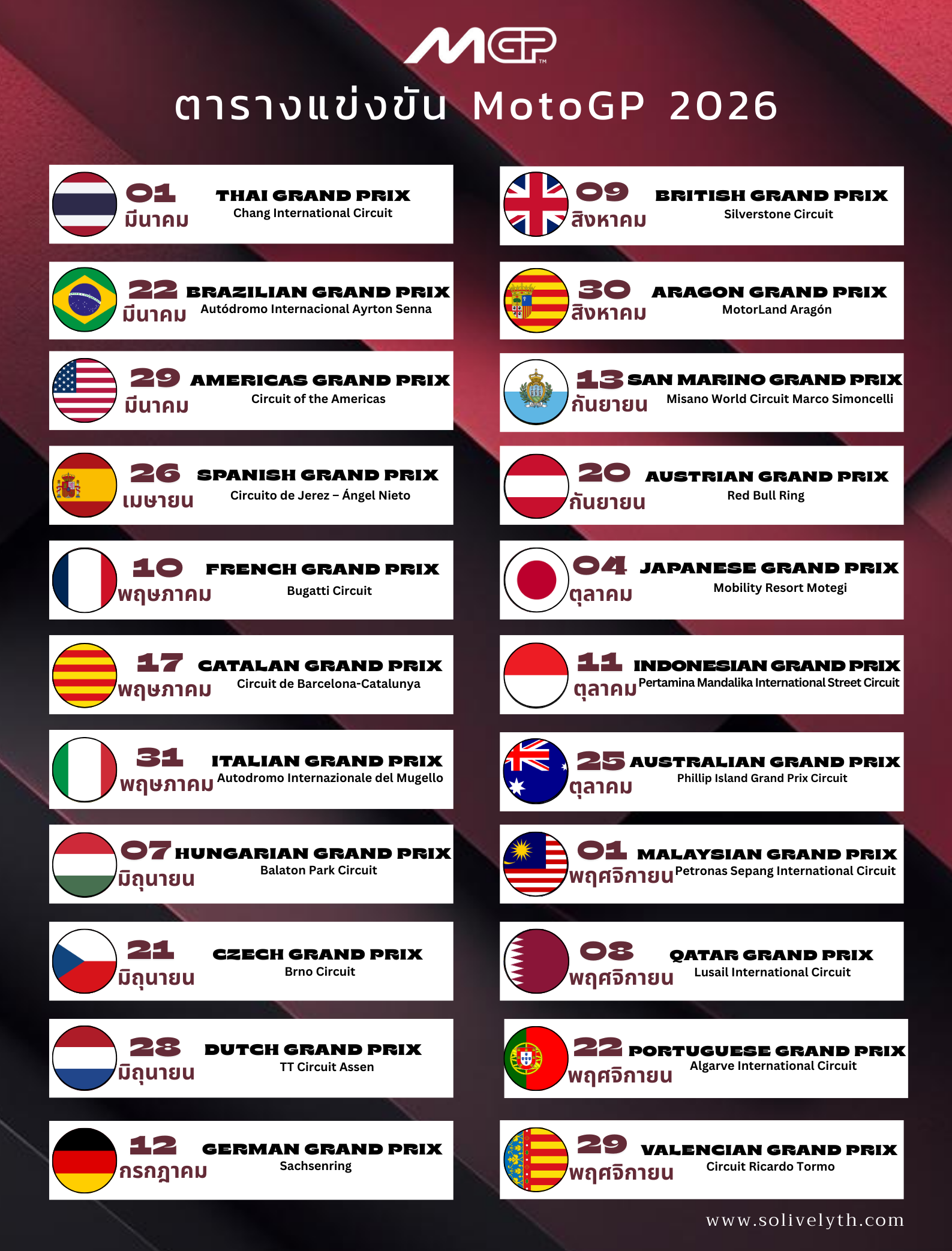MotoGP เผยปฏิทินการแข่งขัน MotoGP 2026 ทั้ง 22 สนาม ครอบคลุม 5 ทวีปทั่วโลก โดยจะเริ่มการแข่งขันตั้งแต่ปลายเดือนกุมภาพันธ์ยาวไปจนถึงปลายเดือนพฤศจิกายน ไฮไลต์ที่น่าสนใจในฤดูกาลนี้คือการกลับเข้ามาในปฏิทินการแข่งขันอีกครั้งของรายการ Brazilian Grand Prix โดยนักบิดทุกคนจะได้ไปเยือน Autódromo Internacional Ayrton Senna ในวันที่ 20 - 22 มีนาคม ต่อจากสนามเปิดฤดูกาลที่ประเทศไทย ส่วนรายการอื่นๆมีการปรับปฏิทินบ้างในบางสนามเพื่อความเหมาะสมกับสภาพอากาศ จะมีสนามไหนบ้างเช็ค ตารางการแข่งขันโมโตจีพี 2026 จากข้อมูลด้านล่างเลย