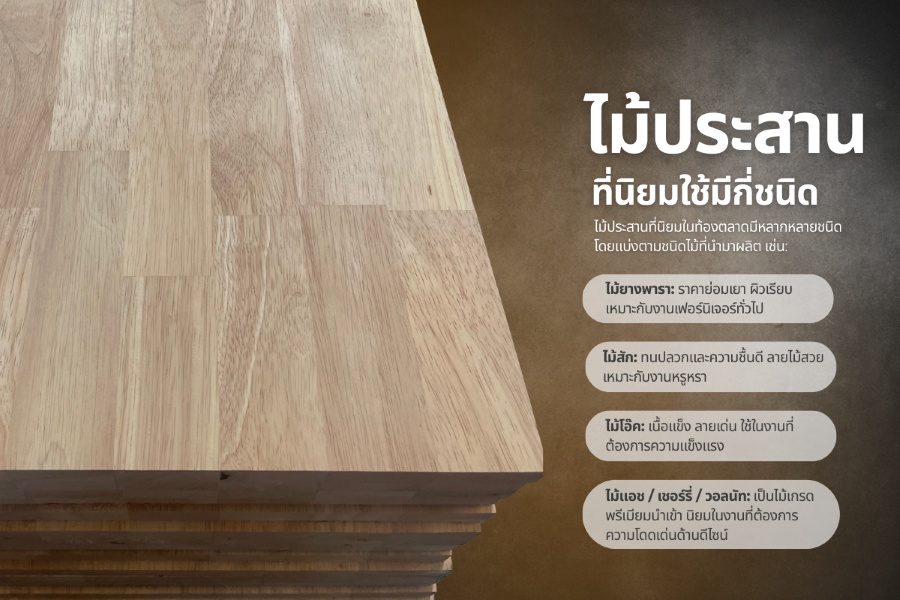 ไม้ประสานที่นิยมในท้องตลาดมีหลากหลายชนิด โดยแบ่งตามชนิดไม้ที่นำมาผลิต เช่น: